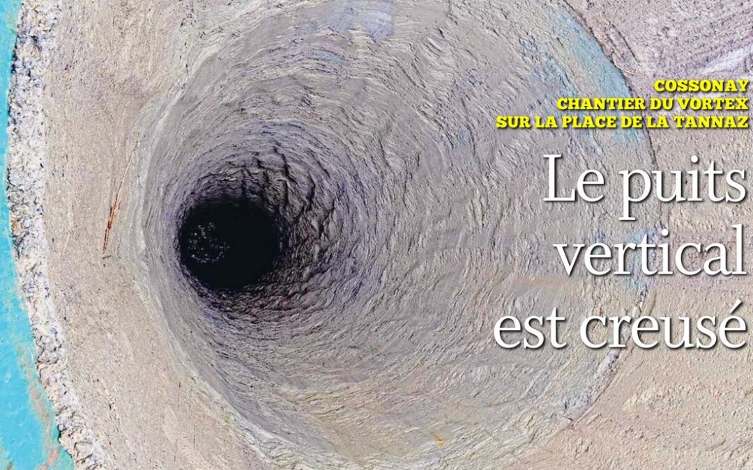 Le 17 juin, le chantier historique du puits à vortex a débuté avec l’arrivée de l’énorme foreuse. Quatre mois plus tard, le 17 octobre, cette foreuse a terminé son travail et le puits vertical est créé. Rappelons qu’entre la place de la Tannaz et le ruisseau des Rochettes (où se déverseront les eaux), on a environ 70m de différence d’altitude. C’est sur cette longueur qu’a été creusé le puits, à un diamètre de 3,20m, au moyen d’une tarière.